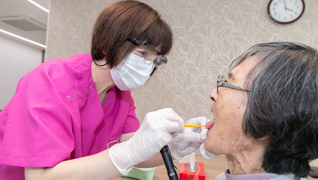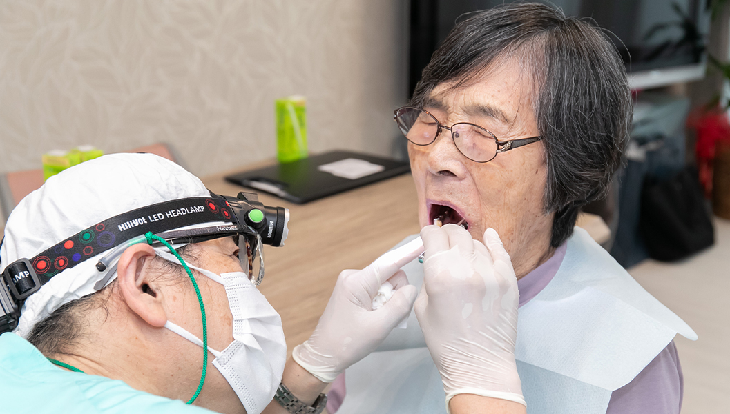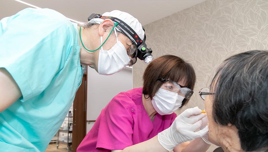 当院の訪問歯科では、歯科医師だけでなく経験豊富な歯科衛生士が、患者さまの口腔ケア(お口のケア)を担当します。普段の歯みがきでは落としきれない汚れをクリーニングするほか、入れ歯のチェックや歯みがき方法の指導も実施します。