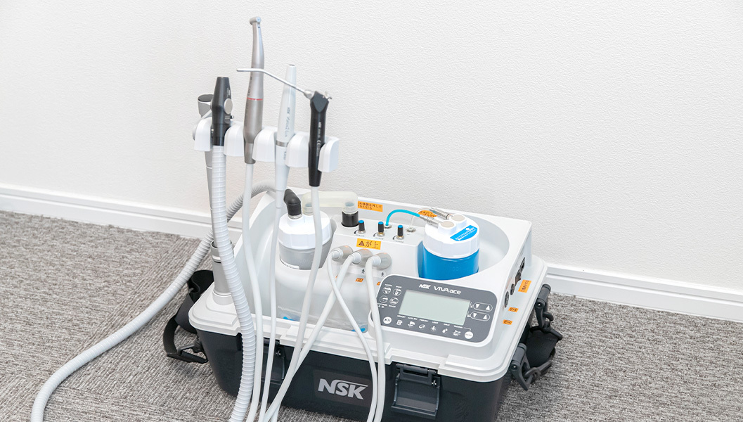 持ち運び可能な専用機材を使用することで、歯を削る・歯石をとるなど幅広い処置に対応できます。さらにポータブルレントゲンも導入しており、歯やあごの状態を詳しく確認することが可能です。