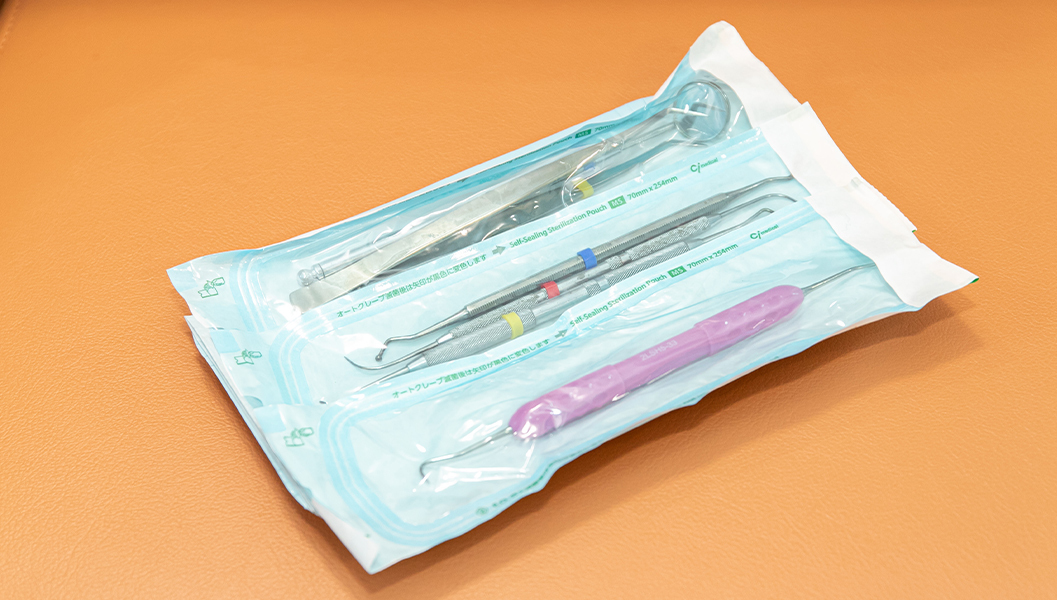 歯科治療で使用する基本的な器具一式です。個包装にしてから滅菌処理を行っているため、清潔な状態を保ったまま持ち運べます。