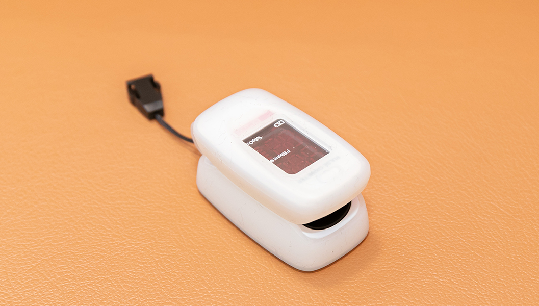 指に装着し、動脈血酸素飽和度(SpO2)と脈拍数を測定する機器です。